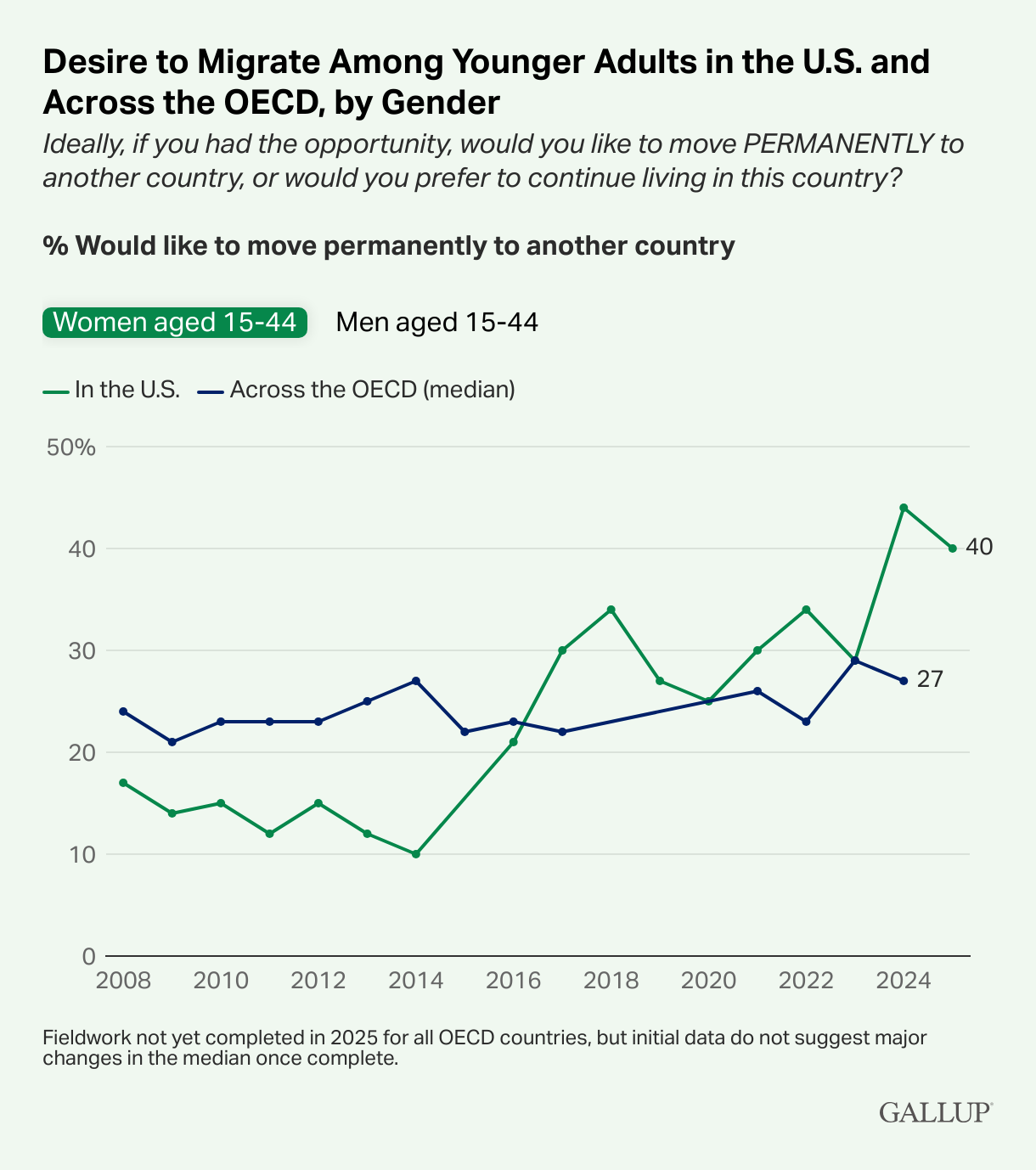 Younger American women are now more likely to imagine their futures outside the U.S. than any group Gallup has ever tracked. Their desire to leave has surged in tandem with collapsing confidence in national institutions and rising political polarization—setting them apart both from older Americans and from younger women in other advanced economies.